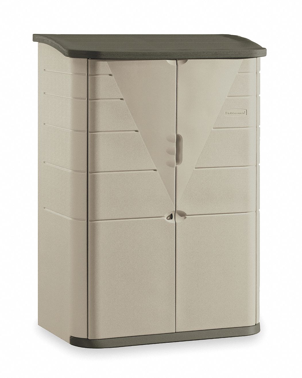 Rubberma - outdoor storage shed,vertical, h 72 in, fg374901olvss, olive/sandston e. email to friends share on facebook - opens in a new window or tab share on twitter - opens in a new window or tab share on pinterest - opens in a new window or tab | add to watch list. seller information.. Outdoor storage shed, patio cabinet - 72"h, 121 gal, vertical, resin, color tan by by outdoor home design. 72”h x 30”w x 25”d 81”h x 52”w x 31”d 47”h x 60”w x 32”d accommodates shelving up to 5 shelves the rubbermaid outdoor vertical storage shed features a double-wall construction for long-lasting and durable use. this outdoor storage shed is easy to assemble and is leak-, dent- and weather-resistant..